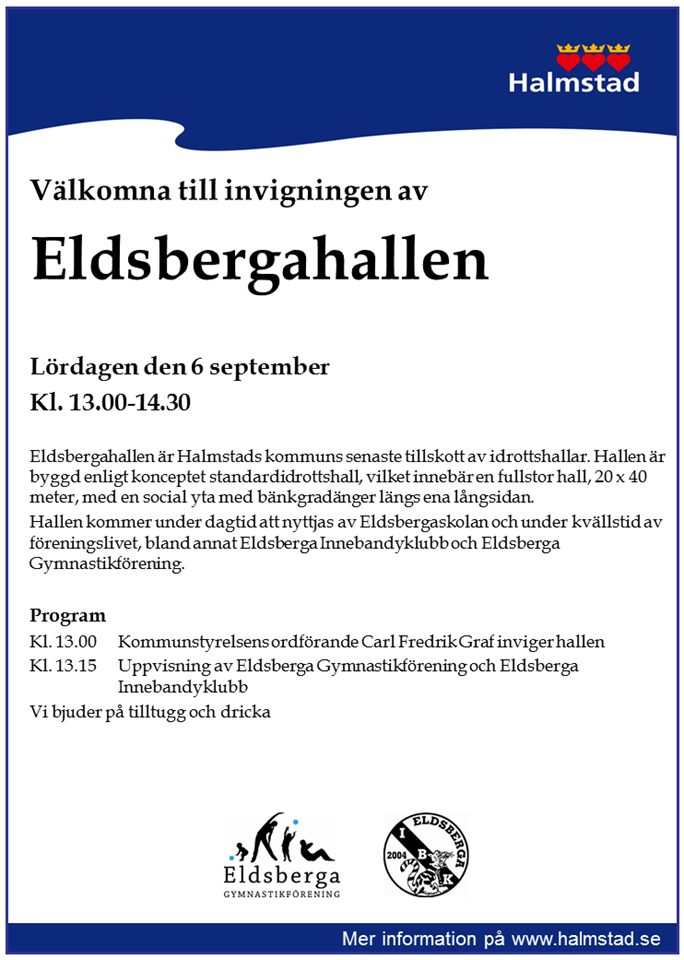 Lördagen den 6 september kl 13 bjuder kommunen in till invigning av den nybyggda Eldsbergahallen! Vi och Eldsberga gymnastikförening kommer visa upp verksamheten. Passa på att kolla in hallen och bjud gärna med nån kompis som inte spelar innebandy än. Eldsberga IBK 28 aug 2014 0kommentarer