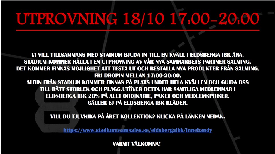 Hej, Då var det dags för en föreningskväll med Stadium Hallarna. Nu kör vi utprovning av storlekar i deras lokaler istället för Eldsbergahallen. Stadium ger oss dessutom lite erbjudanden under vår föreningskväll. I år kommer föreningen att bjuda alla medlemmar på en tränings T-Shirt. (OBS det är inte TRG TEE 2,0 utan en annan Tshirt som inte finns med på profilsidan). Ledare ordnar med sina ledarkläder. För att komma till vår profilsida: Eldsberga IBK Profilkläder Vi vill be dig koppla Eldsberga Innebandyklubb som din stödförening via ditt Stadiummedlemsskap. Det hade betytt jättemycket för oss som förening. Det är enkelt fixat. Steg för steg: På Stadiums Inloggningssida , loggar ni enkelt in med mobilt BankID. Klicka sedan på Stöd din förening och sök upp Eldsberga Innebandyklubb, KLART! Välkomna torsdagen 18/10 på drop-in kl 17-20. Har ni några frågor så tveka inte att höra av er. MVH Jimmy